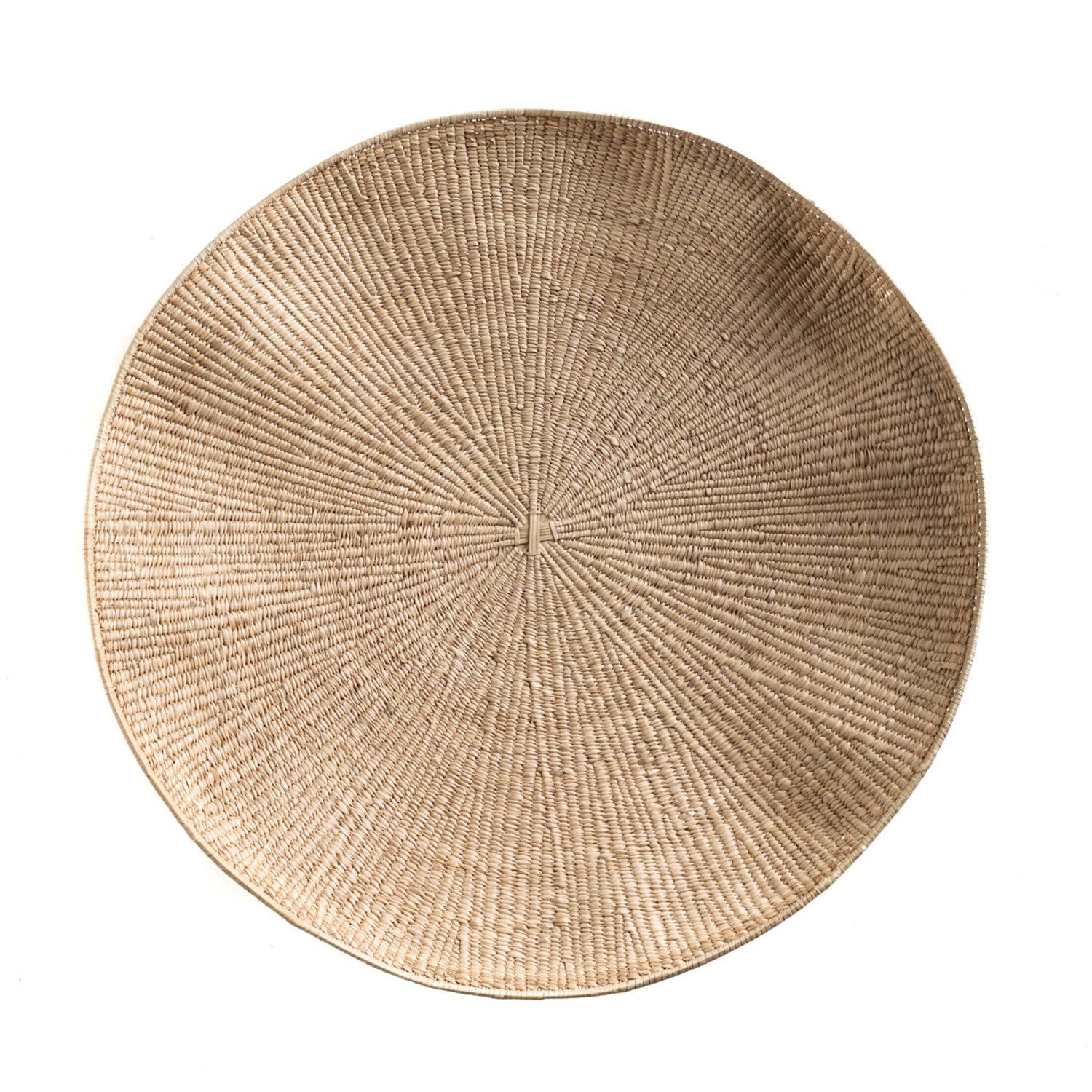 Die für dieses Stück verwendeten Palmblätter werden lokal geerntet und sind wunderbar nachhaltig. Ilala-Palme ist ein schnell wachsendes, erneuerbares Material, das sorgfältig getrocknet wird, bevor es gewebt wird. Dieser langsame, manuelle Prozess ermöglicht es den Fasern, ihre Stärke und Flexibilität zu bewahren, was zu einem Korb führt, der sowohl stabil als auch leicht ist. Die subtilen Variationen in Ton und Webart verleihen der Oberfläche eine sanfte Tiefe, wodurch jedes Stück völlig einzigartig ist.