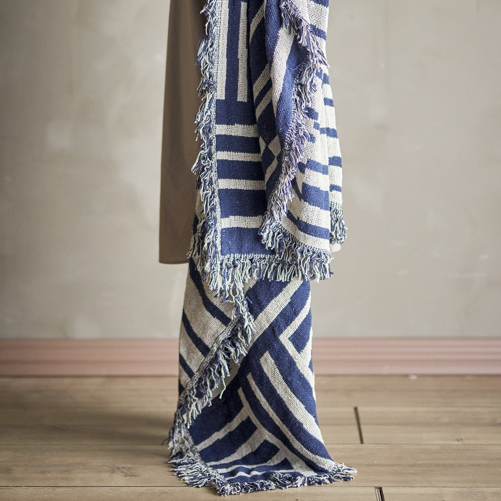 Das Frankie Plaid von Bloomingville zeichnet sich durch eine auffällige gewebte Textur in dunklen Blautönen mit natürlichem Creme und sanften Streifen aus, die sowohl entspannt als auch raffiniert wirken. Dieses wendbare Stück wurde doppelt gewebt, sodass die Rückseite eine subtil kontrastierende Version des Designs zeigt und Ihnen Vielseitigkeit beim Styling bietet. Die fransigen Kanten an allen vier Seiten verleihen einen verspielten Abschluss und einen Hauch von lässiger Eleganz. Mit 160 × 130 cm ist es großzügig genug, um über ein Sofa zu drapieren, sich an einem ruhigen Abend um die Schultern zu wickeln oder ordentlich am Fußende Ihres Bettes zu falten.