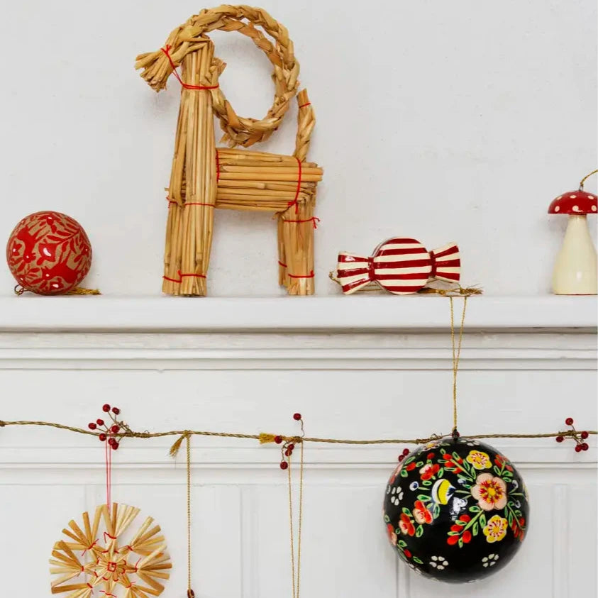 De snoepjes hangers worden gemaakt van gerecyclede kranten die met de hand tot pulp worden verwerkt en gevormd, vervolgens gedroogd en in kleine oplages met de hand beschilderd. Omdat elk stuk door ambachtslieden wordt gemaakt in plaats van door machines, is geen enkele set precies hetzelfde; elke kleurwerveling en penseelstreek draagt het stempel van vakmanschap. Een fijn goudkleurig koord met een klein kwastje maakt elk snoepje af, zodat het prachtig kan hangen aan de takken van je kerstboom.