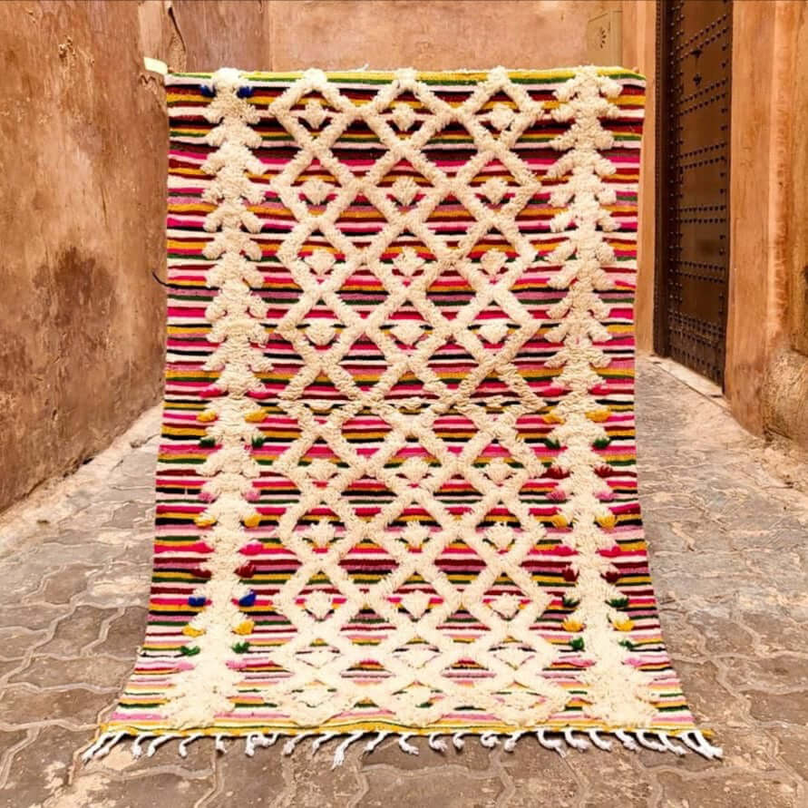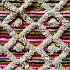 Dit kleurrijke Azilal tapijt is een traditioneel wollen Berber kleed uit de Azilal-regio in Marokko, maar geweven met een nieuwe techniek. Deze moderne stijl heet 'Henbel', wat een gemengde techniek is van weven (de kleurrijke basis) en wol (witte laag bovenop). Deze kleden zie je niet vaak!