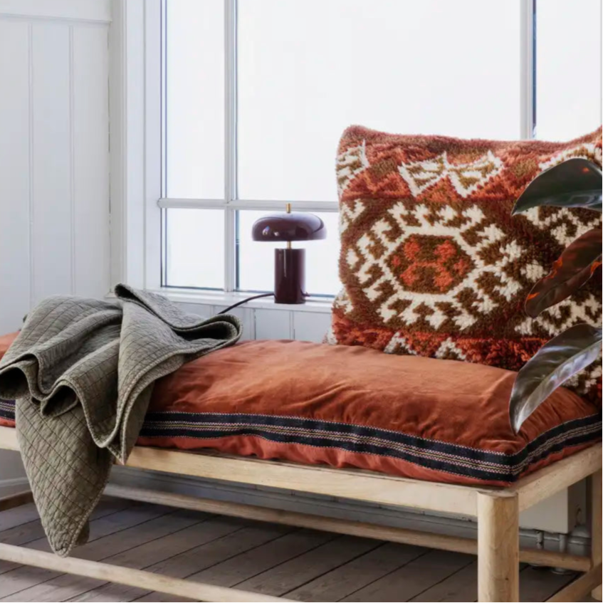 The Kelim-inspired pattern gives the cushion a beautifully textured surface, with soft wool adding depth and a comforting tactile feel. The sturdy cotton back provides extra strength, ensuring this handmade piece is both stylish and long-lasting. The colour palette — brick, tapenade, off white and syrah — creates a grounded, timeless atmosphere, perfect for adding warmth and charm to your sofa or bed.